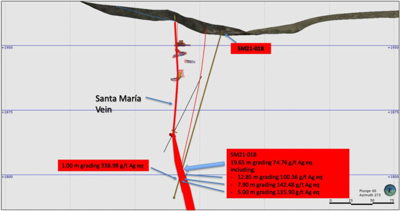 Der Abschnitt von 19,65 Metern mit einem Gehalt von 74,67 g/t AgÄq enthielt drei höhergradige Zonen, wobei eine neue separate Zone auf der anderen Seite der Footwall der Santa-Maria-Struktur identifiziert wurde, die 338,98 g/t AgÄq über einen Meter aufwies.