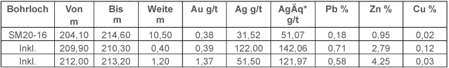 Bohrloch SM20-16 wurde so angelegt, um die Santa Maria Struktur in einer vertikalen Tiefe von -225 Metern zu testen, etwa -50 Meter unterhalb des historischen Bohrlochs SM16-22, das vom vorherigen Projektbetreiber im Jahre 2016 abgeschlossen wurde und einen Gehalt von 113,14 g/t AgÄq über 15,34 Meter enthielt, darin 0,64 Meter mit einem Gehalt von 844,72 g/t AgÄq. (siehe Darstellung 2). Bohrloch SM20-16 enthielt einen breiten Abschnitt von 10,5 Metern mit einem Gehalt von 51,07 g/t Silberäquivalent, wobei höhergradige Abschnitte 142,06 und 121,97 g/t AgÄq über 0,40 bzw. 1,20 Meter enthielten.