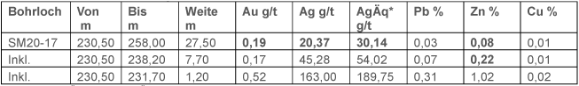 Auch hier wurde eine breite Zone mit einer Silbermineralisierung angetroffen, die 27,50 Meter mit einem Gehalt von 30,14 g/t AgÄq und höhergradige Abschnitte einschließlich 1,20 Meter mit einem Gehalt von 189,75 g/t AgÄa aufwies.