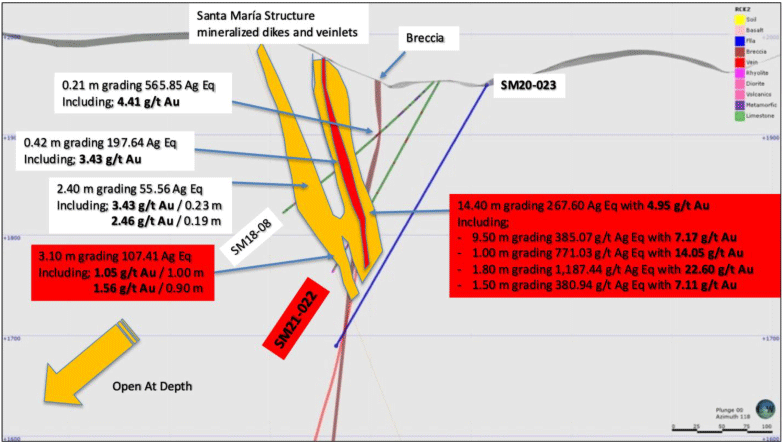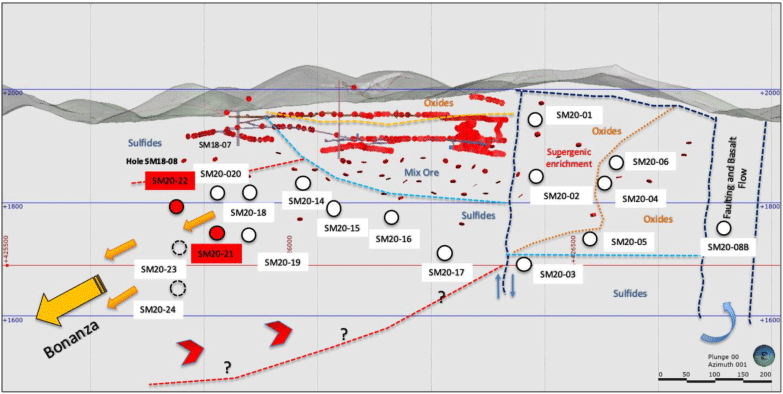 Der nächste Bohrloch-Rahmen SM20- 22, 23 und 24 befindet sich 75 Meter westlich der Bohrstellen von SM20-19-20 und wurde konzipiert, um die Santa-Maria-Struktur in einer vertikalen Tiefe von -175, -225 bzw. -275 Metern zu durchschneiden, wobei eine neu interpretierte Mineral-/Struktur-These verwendet wurde, die eine neue Goldmineralisierung beinhaltet, die 45 Grad nach Westen abfällt und in alle Richtungen offen bleibt.