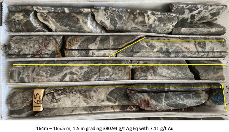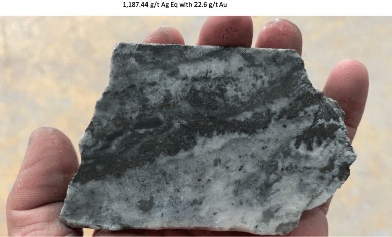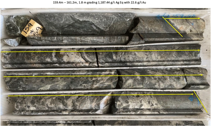 Peter J. Hawley erklärt: "Wie unten in den Tabellen 2 und 3 und in den Fotos 1 bis 4 zu sehen ist, definieren wir weiterhin ein neues, noch nie entdecktes hochgradiges Goldmineralisierungssystem mit Silberanteilen über konsistente Mächtigkeiten in einem noch nie explorierten Gebiet, das nach Westen und in der Tiefe offen bleibt, um 45 Grad nach Westen abfällt und in alle Richtungen für eine Erweiterung offen ist.